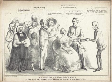 道尔绘,《非同寻常的放血!或为了宪法利益而进行的伟大的放血术》道尔早年的讽刺漫画作品一直署名为H.B.,直到1843年,他在写给当时已任首相的皮尔的信中,揭开了这个秘密。《泰晤士报》曾以“H.B.的政治素描”为题对道尔以漫画介入政治的方式作出如下评论: