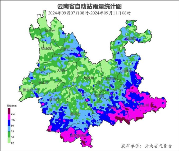 多站日雨量突破历史极值。普洱市、西双版纳州、文山州、红河州有57个乡镇站日雨量突破有记录以来的历史极值,最大单日雨量达311.4毫米(9月9日金平县勐桥乡勐坪站)。