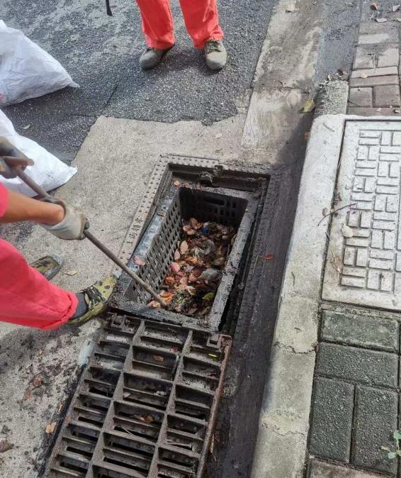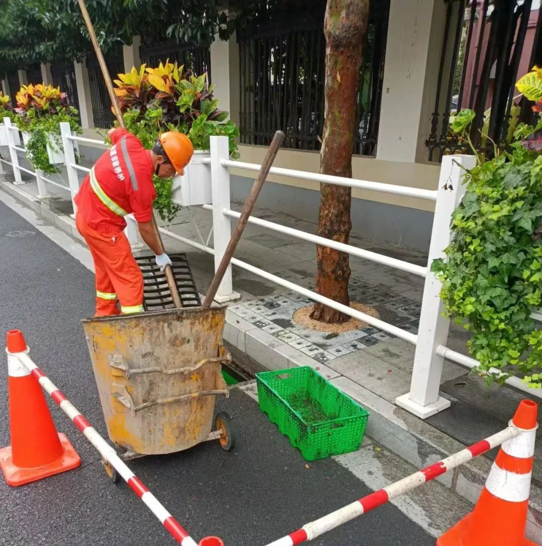 崇明排水所针对易积水点、重点保障地区、农贸市场及餐饮集中区域等关键部位,疏通管道、清理雨水口及截污挂篮。