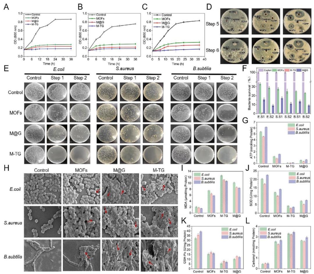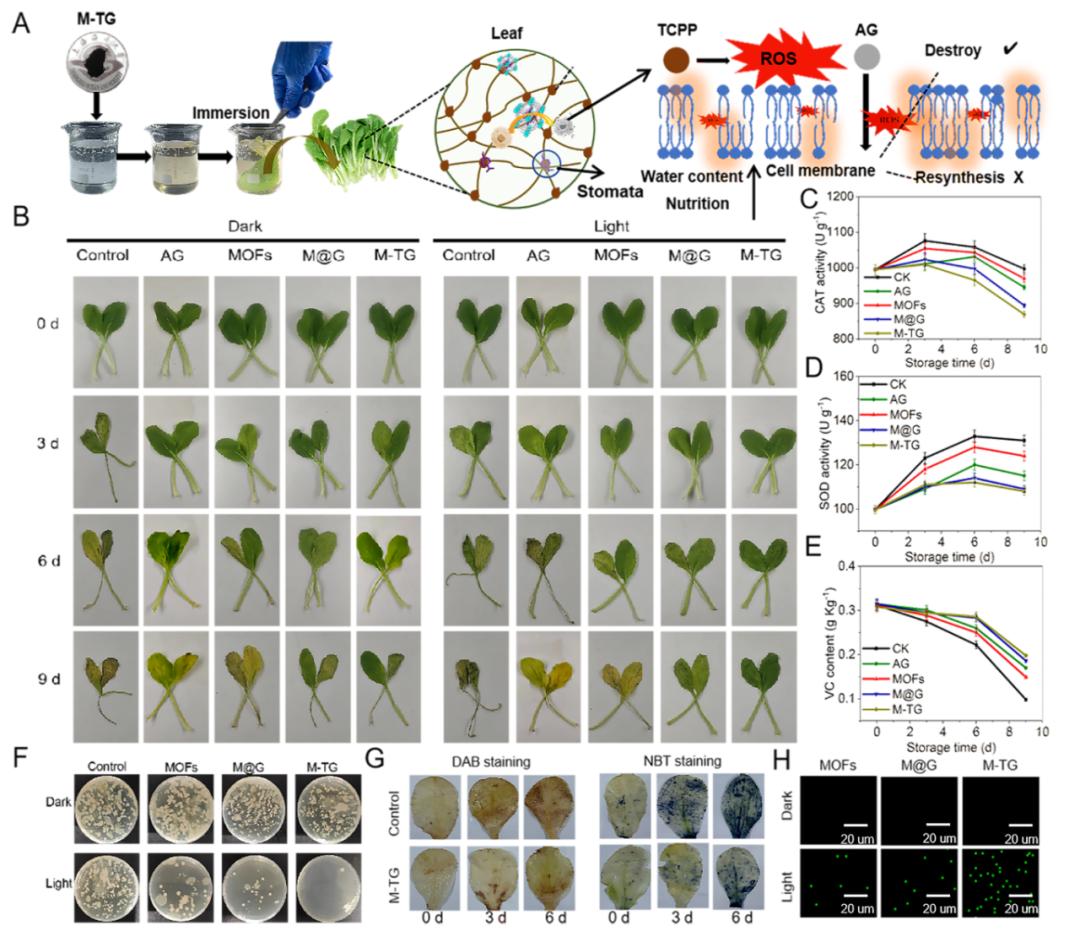 团队通过双配体策略研发的新型光动力金属有机框架,利用卟啉的膜破坏能力和甘草酸铵对细菌膜合成抑制作用进行协同抗菌,充分利用甘草酸铵的特性补充卟啉在缺乏光照和氧气条件下的杀菌效果,大幅提高了Ⅱ型活性氧的产量。经实际应用表现,如鸡毛菜的货架期被延长了5天以上、生鲜鱼片的货架期被延长了3天以上。