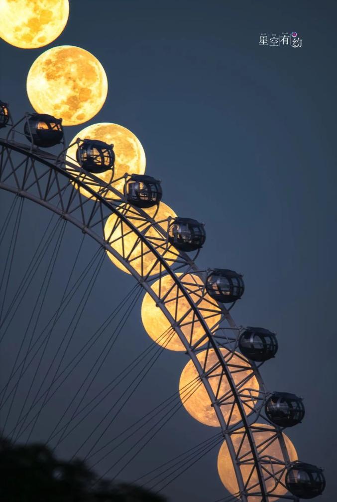 星空摄影师魏伟2023年9月29日(农历八月十五)在福建福州拍摄的中秋月(多张叠加),也是一轮“超级月亮”。(星联CSVA供图)值得一提的是,这次满月发生时还会迎来一次食分非常小的月偏食,即月亮的一部分处在地球的本影之内,在地球上看来,月亮会出现部分残缺。