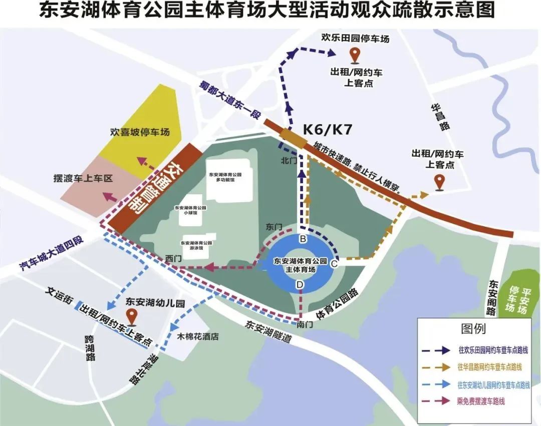 1、欢乐田园候客区:散场后,场馆北门附近的观众,可经BRT快速公交下穿通道或体育公园路蜀都大道下穿人行通道前往上客点。场馆东门附近的观众,可经体育公园路蜀都大道下穿人行道前往华昌路登车。