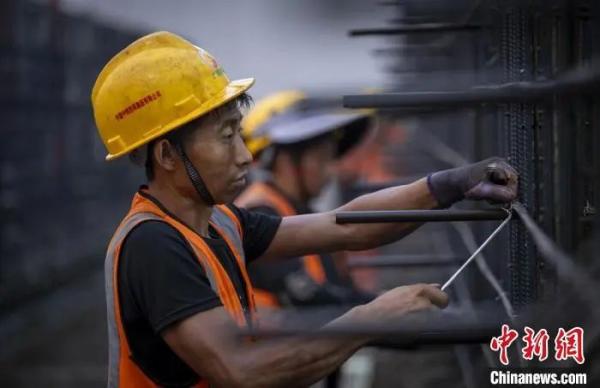 图为工人在进行钢筋绑扎作业。胡飞宇 摄为抢抓黄金施工期并保证合龙段混凝土成形质量,建设者们中秋假期奋战在施工一线,选择在适宜温度下连夜进行浇筑,让该桥连续梁在中秋节前夕成功实现“牵手团圆”。
