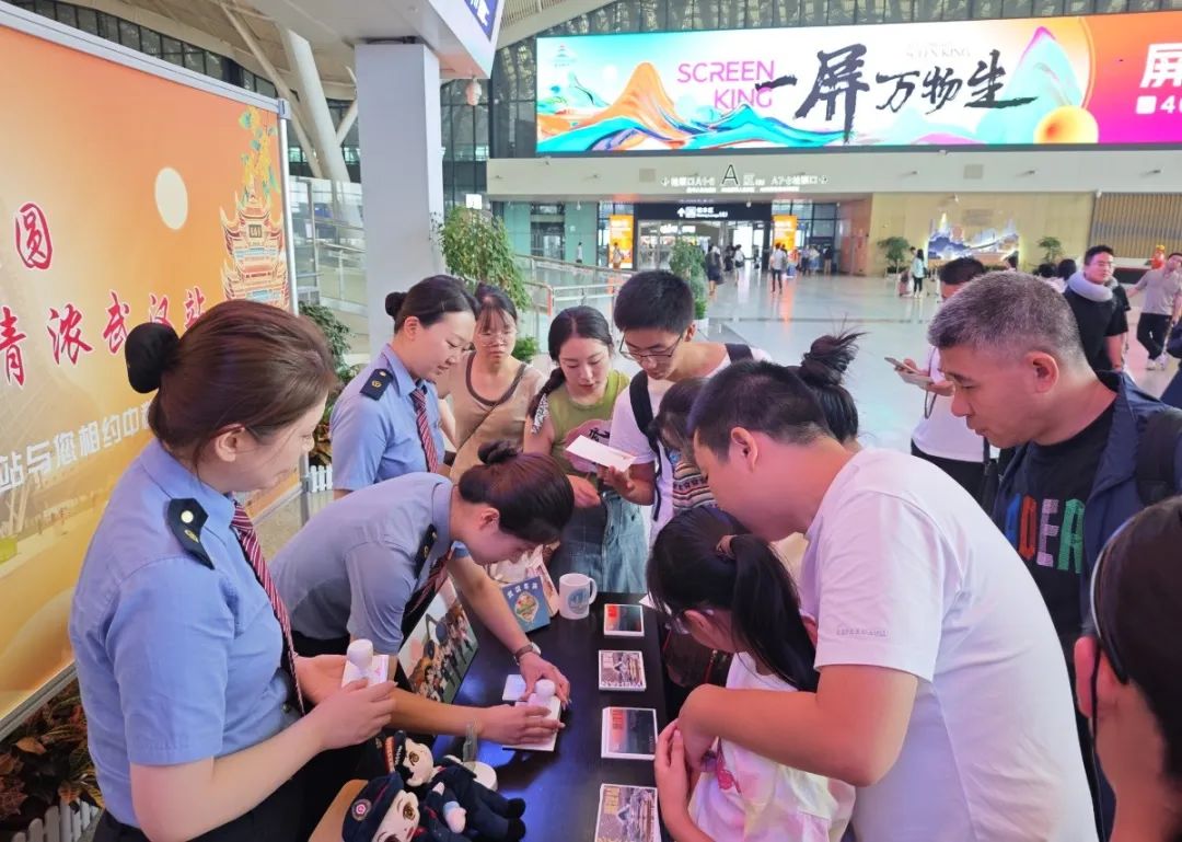 汉口、信阳等客运车站在候车区域开展文明出行主题互动活动,为旅客免费提供百香果茶、菊花茶、玫瑰茶等饮品并发放高铁文旅产品推介和路外安全宣传册。