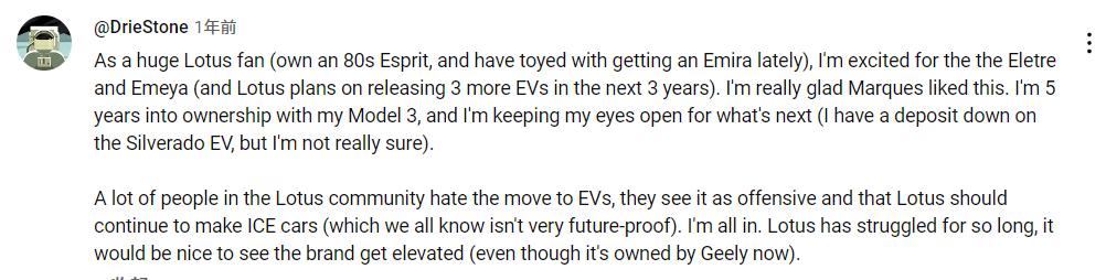 另一方面,纯电的 Eletre 、 Emeya ,好是好,但轻量化丢了( 2.6 吨 ),粉丝也很难买账。外国粉丝兼车主对莲花现在的纯电道路表示疑惑