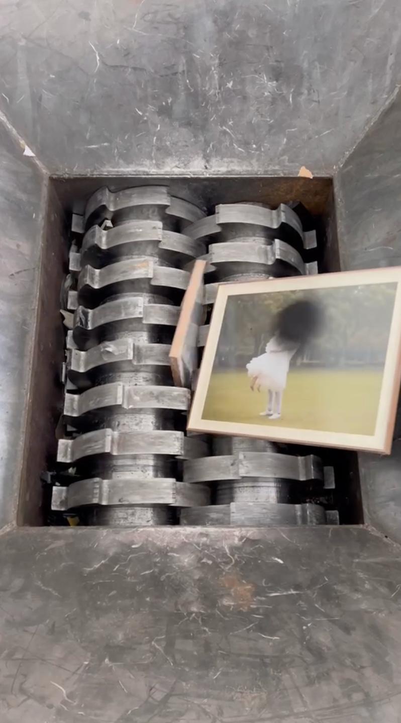 将婚纱照拆包、喷漆、丢进撕碎机里进行粉碎,几分钟后,产出的碎片会被收集到一起,统一被清运车送去电厂,在1000度高温中溶解。尘归尘,土归土。