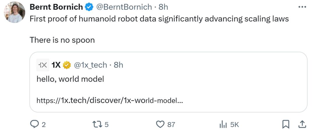 1X 创始人兼 CEO Bernt Bornich 表示,这是人形机器人数据显著增强扩展定律的首个证据,「没有勺子」。