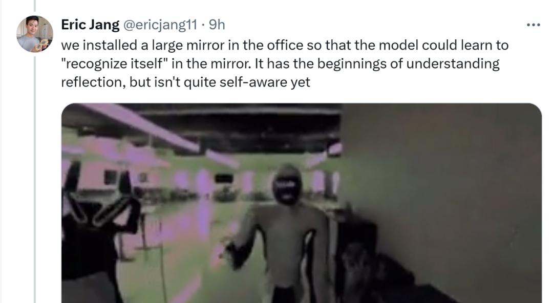 研究团队让 EVE 走到镜子前,以观察它能否生成与镜子中动作相一致的行为。
