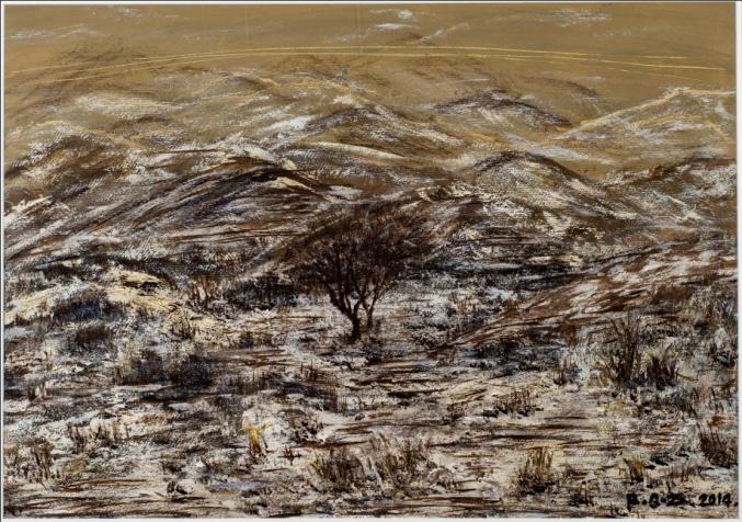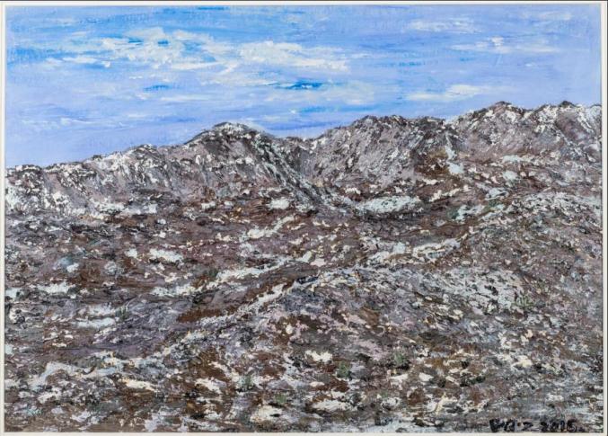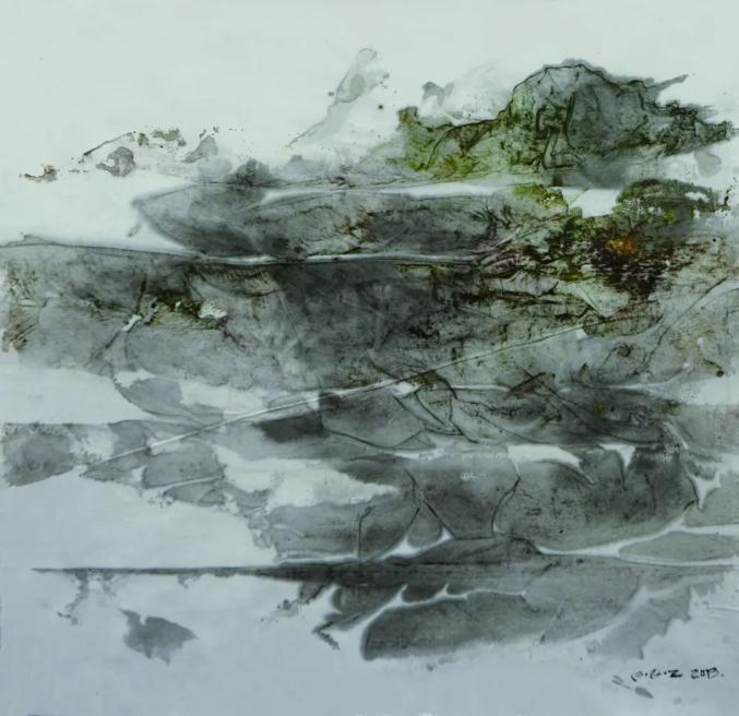 白音布朗山系列·冻土地下(纸本彩墨 70×70cm 2013年 冯秋子 绘)克拉克说,“这是感觉美学的最极端和最夸张的陈述”。是的,绘画的色彩是依靠肉眼来调配,而其表现的内容力度却是依赖心灵觉悟来体现。从这个角度上来解读秋子的绘画与散文作品应该是一个准确的切入点。同样,我们在这本写景之外的记人散文里也看到了自然风景画艺术家钟蜀珩先生对秋子画的评价:“你画得很美,单纯、细腻、真挚,艺术在心中不分门类,是相通的。”也正是这种通感成就了秋子散文的独特性。百年来,除了丰子恺的散文小品外,没有哪个画家能够写出更好的散文来,没有哪个文学家能够画出具有现代意识的好油画来。虽然冯骥才、贾平凹、忆明珠那样的大作家也画画,但是他们都是沿着中国传统文人画的路子行走,能够吸收西方油画艺术风格入散文,以此形成对位与互文关系者罕见。
