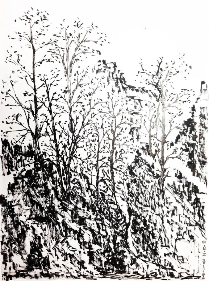 苏勒图的山(钢笔 碳素笔 2013年 冯秋子 绘)让我意外得到启蒙的描写,是作者对蒙古族灵魂交流处所“敖包”的阐释,我们这几代人是听着那动人的爱情歌曲《敖包相会》成长起来的,以前我并不理解敖包一词的涵义。当知道那是一个坟场墓地的时候,一种不祥之念瞬间掠过,却仍然抵挡不了它的旋律和歌词的诱惑。尤其是在20世纪六七十年代,我们躲在乡间小屋里放声歌唱,虽然那时广播电台里不时传出的是男高音歌唱家胡松华的那首由蒙古长调改编的《赞歌》,尤其是开头部分的长调前曲哼唱,优美的旋律竟然让我们忘却了歌词的表达。《敖包相会》是我们在广阔天地的荒原里寻觅天籁情感的最美寄托。作者笔下“荒原”里的敖包,“是老人们与上天、与辽阔久远的历史交换心灵话语的地方。敖包储藏了激情、梦想、愿望;敖包点化了一个又一个冥顽之心;敖包通向远方;敖包既是一个高点,也是一个灵魂栖所,或者就是心灵驿站。对于成人来说,敖包包容了他们的日常生活和精神寄予;琐碎的一切,都在它的眼里溶解为水,滋养心田,哺育长久而艰辛的生长。敖包,差不多就是他们心目中的旗帜,是他们启程路上的号令,疲惫、迷惘、困顿时的救助塔台”。到这里,我的心灵豁然开朗,从而彻底理解了欧美人为什么会把墓场建成公园。同样是祭祀,他们与蒙古民族的相似之处就在于除了把庄严的忏悔和深切的悲痛化为生活的力量外,更是用戏谑的方式把生活的悲剧变成喜剧,这从死者俏皮的墓志铭上和播放的轻松曲目中就可感知到他们对生命的另一种理解方式。从这个角度来思考,就顿悟了为什么每年维也纳新年交响乐中最后一首保留曲目永远是《拉德斯基进行曲》,这是生命和生活的结束,也是生命和生活的开端。用此来解释生活在“荒原”里的人们大体是不错的。