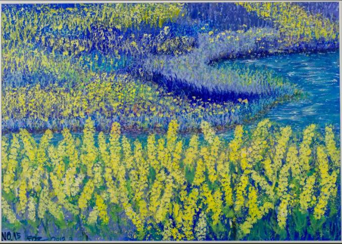 白音布朗山系列·辉腾锡勒(丙烯 53×38cm 2015年 冯秋子 绘)在《白音布朗山》里,我们仍然可以看见作者描绘出的草原风景组画的脉络,其给人遐思的空间远远大于静观画面的视觉冲击力,以我浅见,秋子的绘画在技法上并不是一流的,但是,作为一个现代油画者,她的思想价值是远远高于一般油画家的,这不仅是因为她对色彩的敏感,更是因为她对绘画艺术有着深刻理解。她的这一段话简直可以作为画论的经典语录:“假如我双目失明了,视觉出现了障碍,那些物质在你眼里便不存在——而双目失明仍然是一种物理现象,它局限和阻止了你对这个世界的直观认识,局限和阻止了你的身体力行更远之境,因为你目不能识,你和世界的关系大打折扣。而你的觉悟假若辽远深邃呢?景象就会不同,但那是心灵帮助你完成了抵达,而不是你的眼睛。所以你从心里把这些屏障你的物质的东西剔除掉了,它也就无法阻拦你心灵的透视力和觉悟力。”这让我立刻想到了印象主义大师莫奈的那句使古典主义油画真正走进现代性绘画的至理名言:“我希望自己生来就是一个盲人,然后忽然获得视觉,在不知道物体是什么样的情况下去画眼前的一切。”