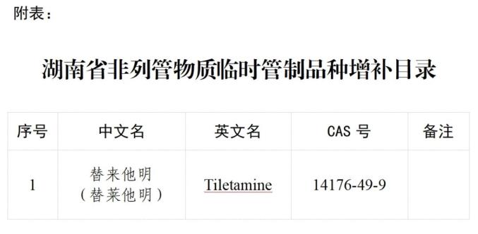 为加强对非列管物质的监督管理,保护人民群众的身体健康和生命财产安全,维护社会治安稳定。湖南省公安厅、湖南省卫生健康委员会、湖南省药品监督管理局、湖南省禁毒委员会办公室联合印发《湖南省非列管物质临时管制试行办法》,明确将“替来他明”纳入湖南省非列管物质临时管制品种增补及相关管理要求,公告自2024年9月18日起施行。