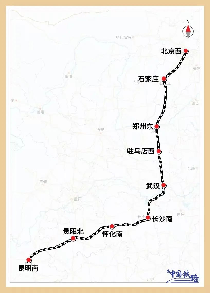 独特又温馨的乘车体验2017年1月,随着沪昆高铁全线贯通,北京与昆明间首次开行动车组列车,当时运行时长约13个小时,停靠24个车站,使用的车型是和谐号动车组。