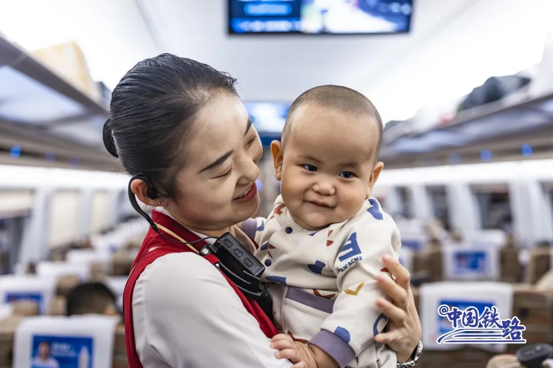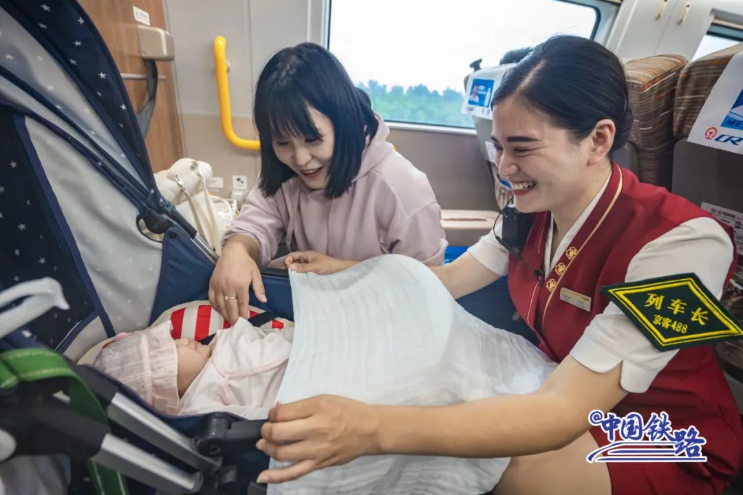 6号车厢内,“00后”女乘务员刘思甜怀抱着数月大的婴儿,一会儿帮忙冲奶粉,一会儿协助换纸尿裤……“老人家自己带着外孙出门不容易,我现在照顾小宝宝的手法越来越娴熟了。”刘思甜笑着说。