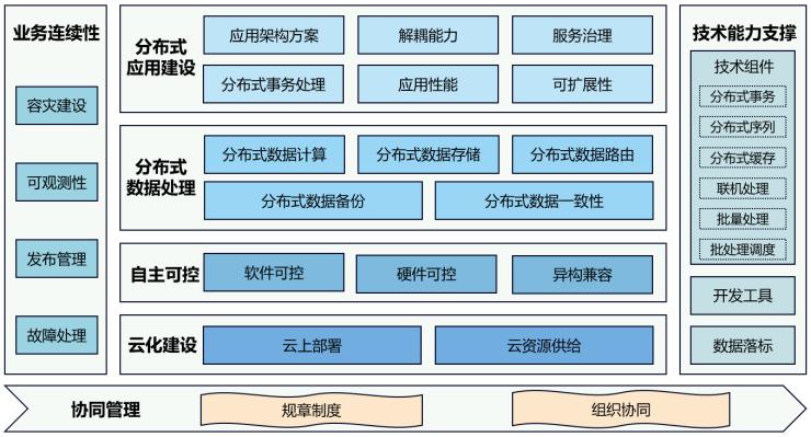 评估简介:银行核心系统现代化建设水平评估包含分布式应用建设、分布式数据处理、自主可控、业务连续性保障、云化建设、技术能力支撑、协同管理7大能力域,25类能力项,44个能力子项。