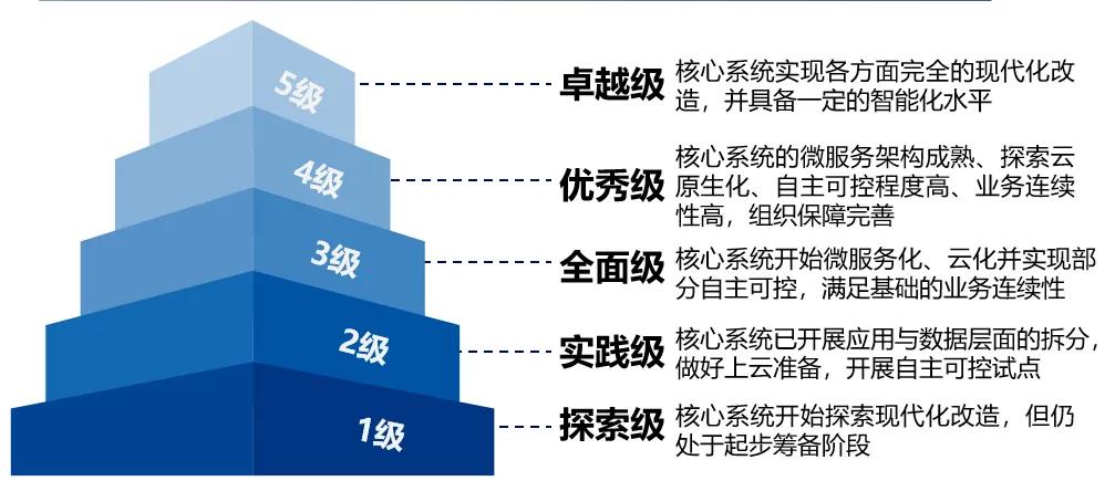 可自由选择单域度量和完整度量两个维度,分为探索级、实践级、全面级、优秀级、卓越级5大级别,全面衡量银行核心系统建设情况。