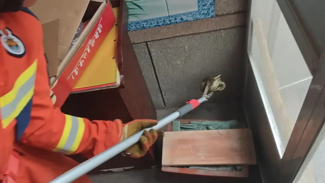 消防救援人员到场后发现,一条长约80公分的小蛇盘踞一团在该户村民入户门内角落处,消防救援人员立即用捕蛇器夹住蛇头使其无法移动而后将蛇装进编织袋里,最后在安全区域将其放生。