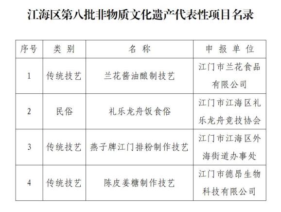 近日,经区文化广电旅游体育局推荐以及专家评审小组评审,江门市江海区人民政府确定了“兰花酱油酿制技艺”“礼乐龙舟饭食俗”“燕子牌江门排粉制作技艺”“陈皮姜糖制作技艺”列入第八批区级非物质文化遗产代表性项目(共计4项)。