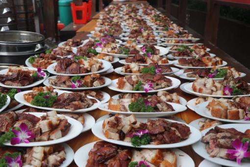 礼乐龙舟饭食俗植根于当地的扒龙舟习俗,是当地村民加强交流、沟通感情的重要渠道之一。礼乐龙舟饭的种类分成4种,包括训练期间的龙舟饭、端午期间的龙舟饭、出大标后的龙舟饭、新龙升水的龙舟饭,其中以出大标后的龙舟饭最为隆重。龙舟饭的地点一般在本里坊,在当地的酒楼、或龙舟基地、村委会、神庙举办。龙舟饭的传统菜式包括:礼乐烧猪、冲菜、胜瓜炒洋葱、头菜炒猪肉、生菜、粉丝、白切鸡和鱼丸等,同时各坊还会根据时令食材搭配不同的菜品。燕子牌江门排粉制作技艺