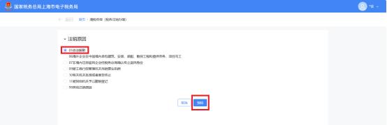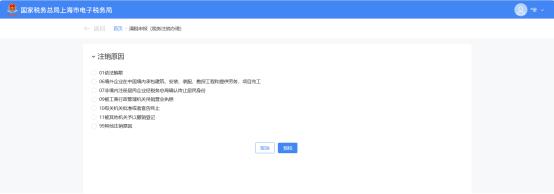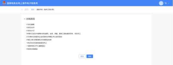 第二步,跳转至清税申报(税务注销办理)界面,展示注销原因。1.非跨区财产税主体登记纳税人,展示所有注销原因。