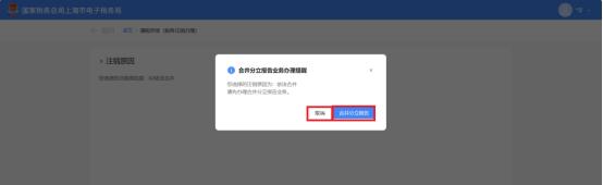 2.注销原因为【02依法合并】、【03依法分立】时。弹出合并分立报告业务办理提醒:“您选择的注销原因为:依法合并。请先办理合并分立报告业务。”,点击【合并分立报告】系统跳转至合并分立报告功能界面进行业务办理(具体操作请查看《合并分立报告》操作手册)。点击【取消】返回功能界面。