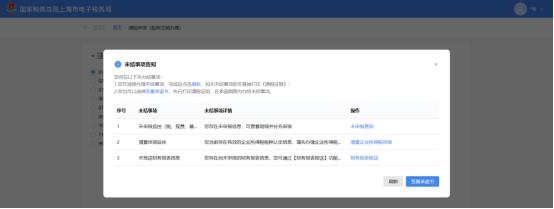 2.即办注销不通过时。(1)符合即办注销资格及条件,但存在未办结事项,且未办结事项存在非提示类事项时。弹出未结事项告知界面,系统提示“您存在以下未办结事项:1.您可选择办理未结事项,完成后点击刷新,如无未结事项即可直接打印《清税证明》;2.您也可以选择签署承诺书,先行打印清税证明,在承诺期限内办结未结事项。”,展示未结事项以及对应办理链接按钮。