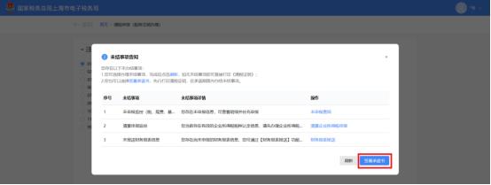 (2)存在未办结事项,且未办结事项都为提示类事项。①弹出未结事项告知界面,系统提示“您存在以下未办结事项:您可选择办理未结事项,或点继续办理进行清税申报。”,展示未结事项以及对应办理链接按钮,点击【继续办理】。