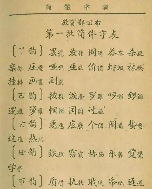 国民政府公布的《第一批简体字表》再到后来新中国建立,1956年1月28日国务院全体会议第23次会议通过了《关于公布〈汉字简化方案〉的决议》,逐步通过报纸杂志等出版物试用推行简化汉字。