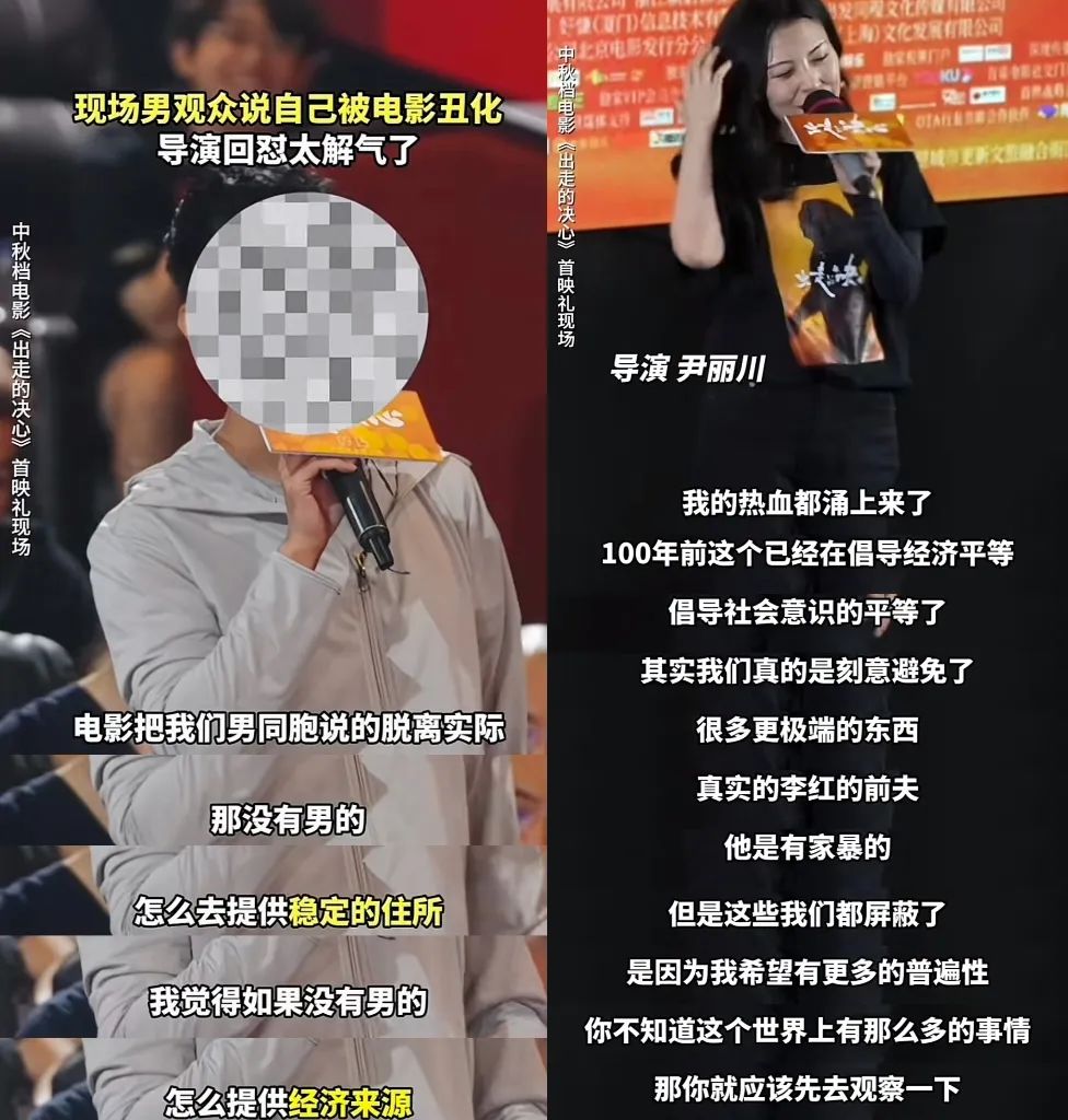 映后一位男观众表示,电影把男性刻画得“脱离实际”,没有男的怎么能提供稳定的住所、怎么提供经济来源、怎么生育小孩。