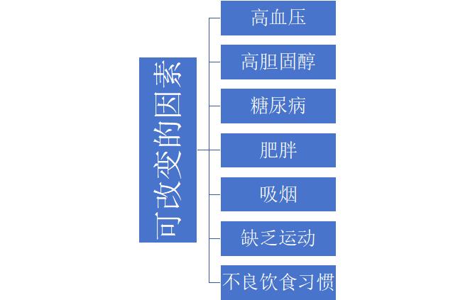 可改变的因素:高血压、高胆固醇、糖尿病、肥胖、吸烟、缺乏运动、不良饮食习惯。