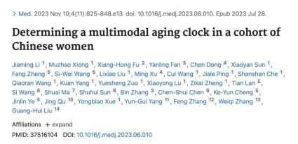 [4] Li J, Xiong M, Fu XH, Fan Y, Dong C, Sun X, Zheng F, Wang SW, Liu L, Xu M, Wang C, Ping J, Che S, Wang Q, Yang K, Zuo Y, Lu X, Zheng Z, Lan T, Wang S, Ma S, Sun S, Zhang B, Chen CS, Cheng KY, Ye J, Qu J, Xue Y, Yang YG, Zhang F, Zhang W, Liu GH. Determining a multimodal aging clock in a cohort of Chinese women. Med. 2023 Nov 10;4(11):825-848.e13.