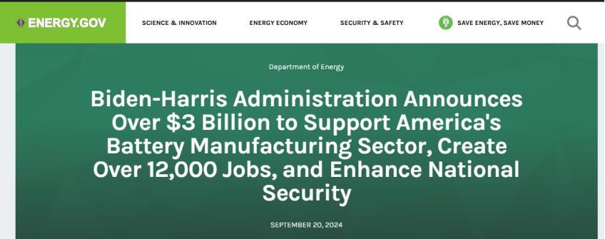 美东时间9月20日,美国能源部宣布,向14个州的25个电池项目拨款超过30亿美元(约合人民币212亿元)。这笔拨款也是美国总统拜登和副总统哈里斯推动电动汽车的生产和销售计划的一部分,也是他们减缓气候变化和建设美国制造业战略的关键要素。获得补贴的公司主要从事于加工锂、石墨或其他电池材料,或生产用于电动汽车电池的组件。