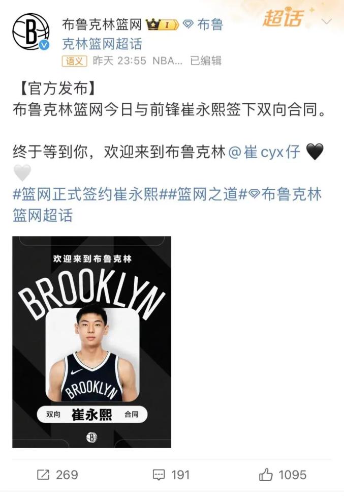 9月21日凌晨,NBA篮网队官方宣布与中国球员崔永熙签下一份双向合同,官方社媒晒图配文写道:“欢迎来到布鲁克林,永熙!” 此后,崔永熙的经纪公司确认,这是一份两年的双向合同。新赛季,他将身披8号球衣。
