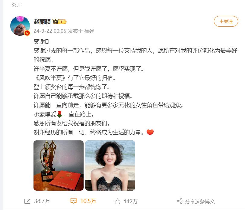赵丽颖凭借《风吹半夏》获得优秀女演员奖 图据:视觉中国9月22日,赵丽颖在社交媒体上发文:
