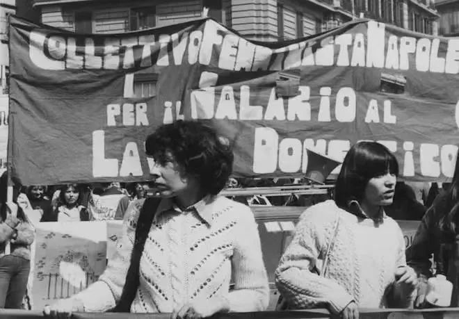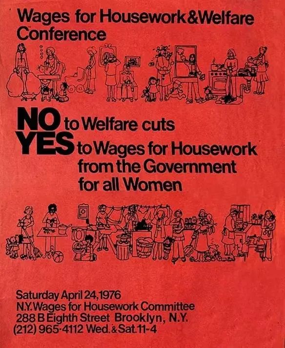 “家务劳动有偿化运动”在纽约的一次会议的海报在20世纪70年代,玛利亚罗莎·科斯塔和谢尔玛·詹姆斯首次提出家务劳动有偿制,并在欧洲掀起了家务有偿化运动。但是在六十年后的今天,中国社会中对于女性无偿劳动的讨论声音依旧不成气候。