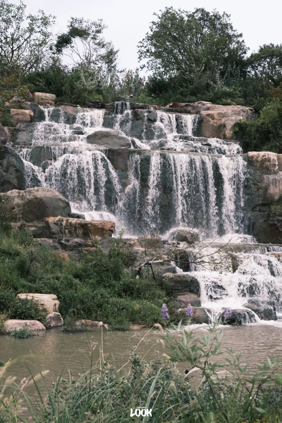虽然双子山是人造仿自然山林,但也有还原自然野趣的山林溪瀑。在山脚下能看到小瀑布景观,爬上山腰,还能近距离走近另一处瀑布溪流。02 | 蘑力乐园