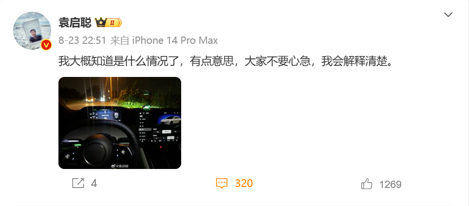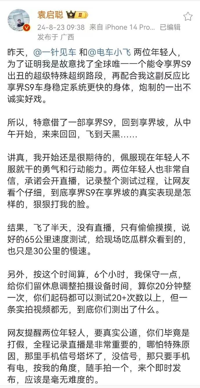 8月23日22:51,袁启聪再次对享界S9进行飞坡测试后表示“大概知道是什么情况了,会解释清楚”。