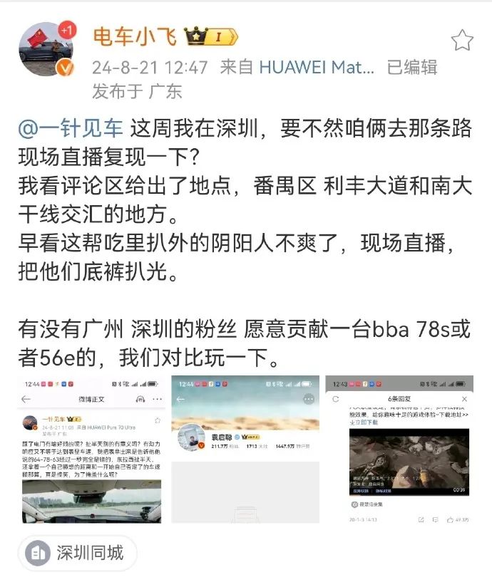 8月21日12:47,汽车博主@电车小飞 同样质疑测试结果,提出与@一针见车 前往测试地点进行复测,并带上一台奔驰S450L作为对比测试。
