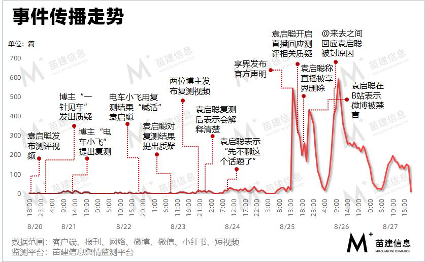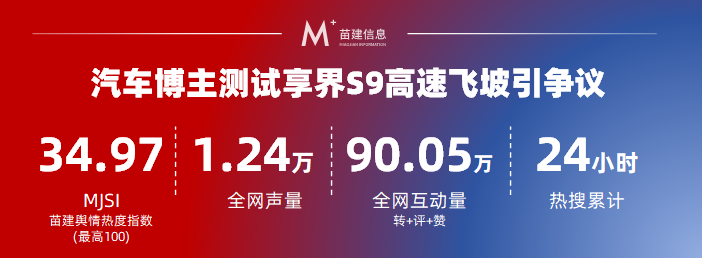 苗建信息舆情监测数据显示,2024年8月20日18:08:00至2024年8月27日18:07:59,全网涉及“袁启聪测评享界S9”的相关内容累计扩散1.24万条,舆情热度指数MJSI为34.97。相关话题#享界回应S9“高速飞坡”测试#、#袁启聪被微博禁言 曾测享界S9引争议#、#车评人袁启聪喊话享界“请起诉我”#等在微博、知乎、今日头条3大平台热搜上榜5次,累计在榜时长为24小时,最高排名为7。