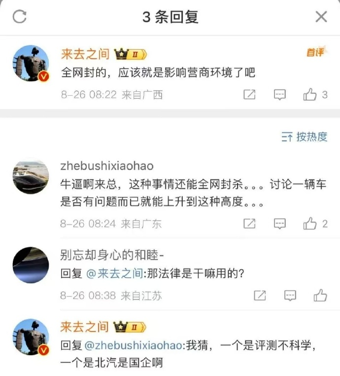 微博-赛车星冰乐:反对通过行政力量去禁言,去干涉互联网的技术讨论和真相发掘。如果讨论车出的问题都上升到民族大义层面,那么国产车就完全没法批评了,怎么进步?如果就剩耍宝露腿编故事去夸车的车评,你们爱看?