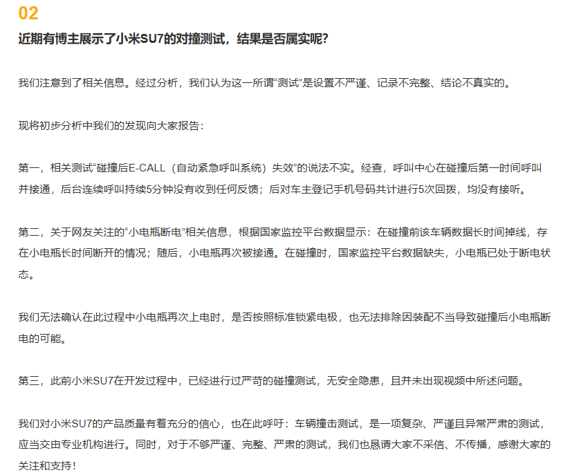 8月14日晚,小米汽车在《小米SU7答网友问(六十七集)》中进行回应。经过分析,认为这一所谓“测试”设置不严谨、记录不完整、结论不科学。小米汽车强调,小米SU7在开发过程中已进行过严苛的碰撞测试,并未发现任何安全隐患,并呼吁车辆撞击测试应交由专业机构进行。