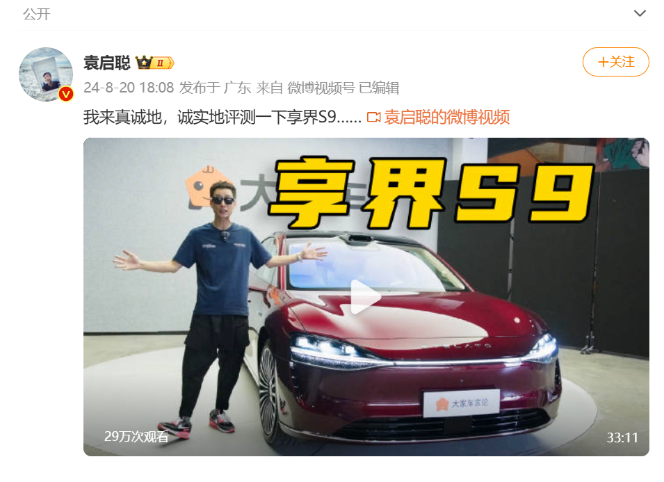8月20日18:08,资深车评人@袁启聪 发布一则测评长视频,配文“我来真诚地,诚实地评测一下享界S9。”其中,袁启聪称车辆飞坡后“无法保持直线行驶,整车偏向一边”。