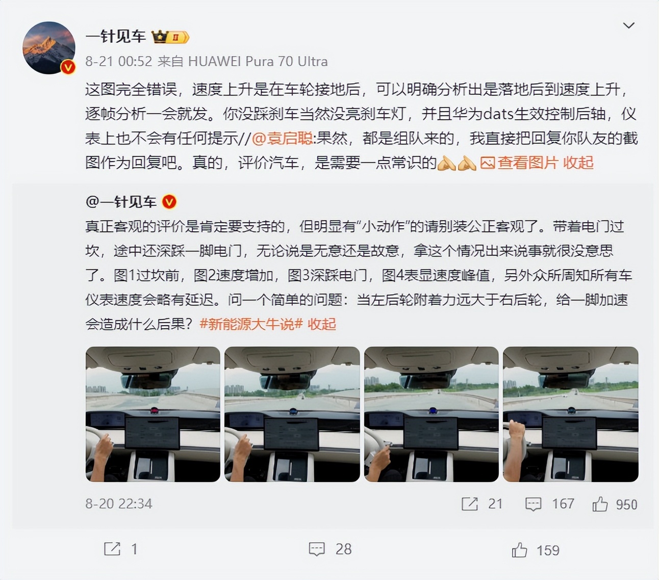 8月21日00:52,汽车博主@一针见车 对袁启聪的测试方法提出了质疑,认为其在测试过程中可能存在操作不当,带着电门过坎,途中还深踩一脚电门。