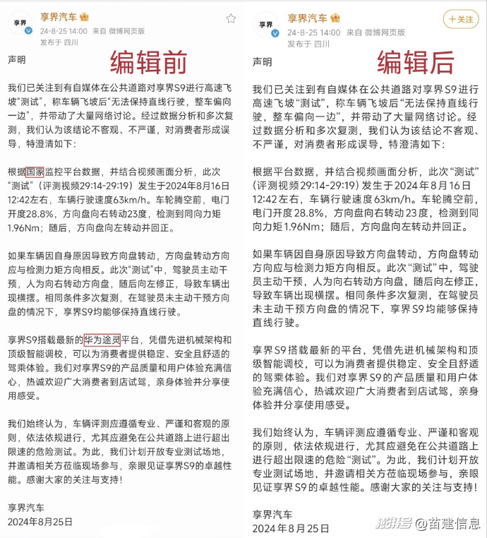 图1:享界声明编辑前后对比