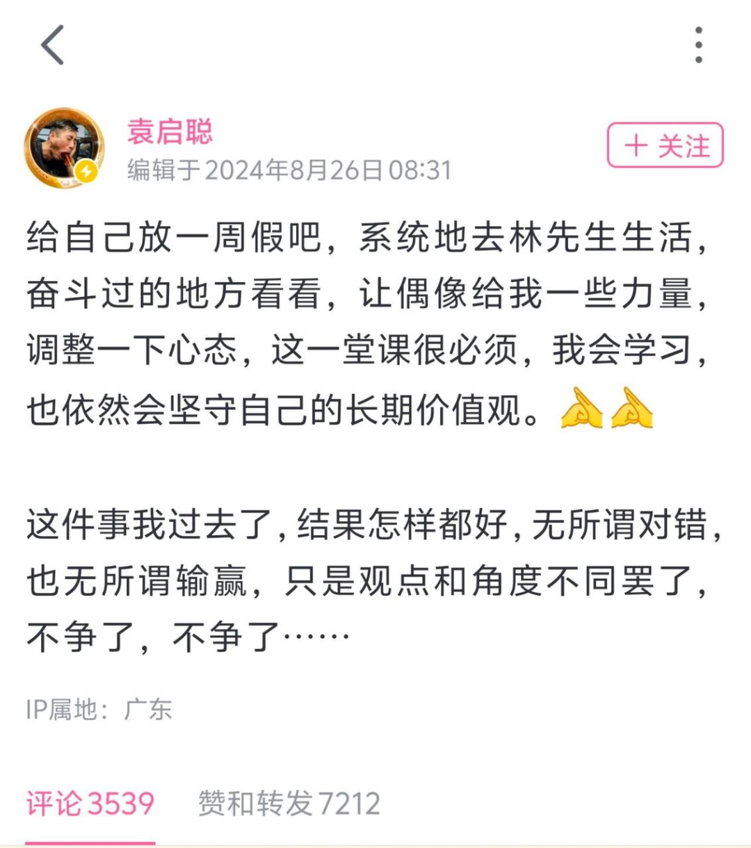 8月26日8:31,袁启聪在B站账号上发布动态表示将给自己放一周假,休息一段时间。