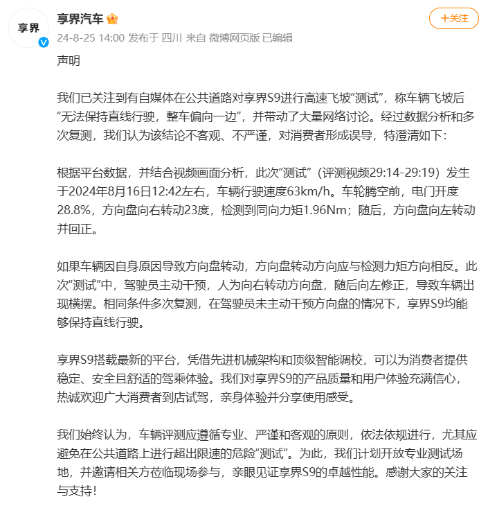 界面新闻:享界汽车回应自媒体享界S9高速飞坡“测试”结论:不客观不严谨