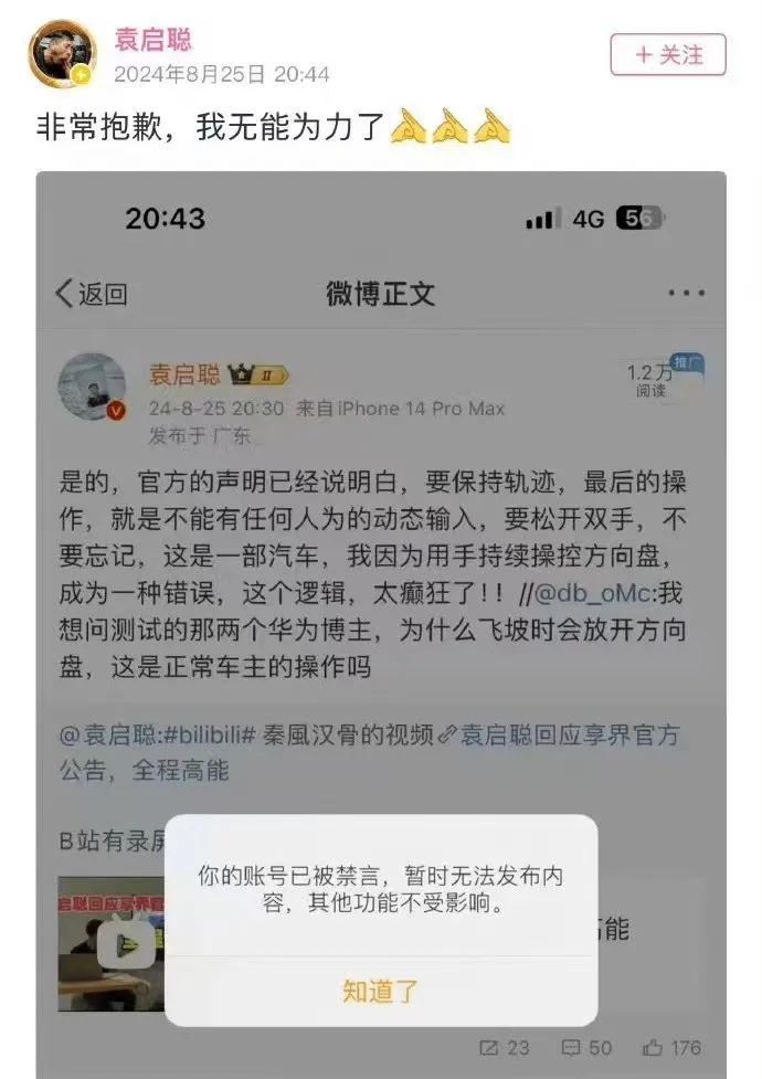 对此,享界汽车8月25日在官微发表声明称,此次“测试”中,驾驶员主动干预,人为向右转动方向盘,随后向左修正,导致车辆出现横摆。相同条件多次复测,在驾驶员未主动干预方向盘的情况下,享界S9均能够保持直线行驶。对于享界汽车的官方回应,袁启聪随后连发多条微博表示“可自证”“会全面回应”。25日当晚,袁启聪开启直播进行回应,不久后其表示直播被删,微博也被封号禁言。