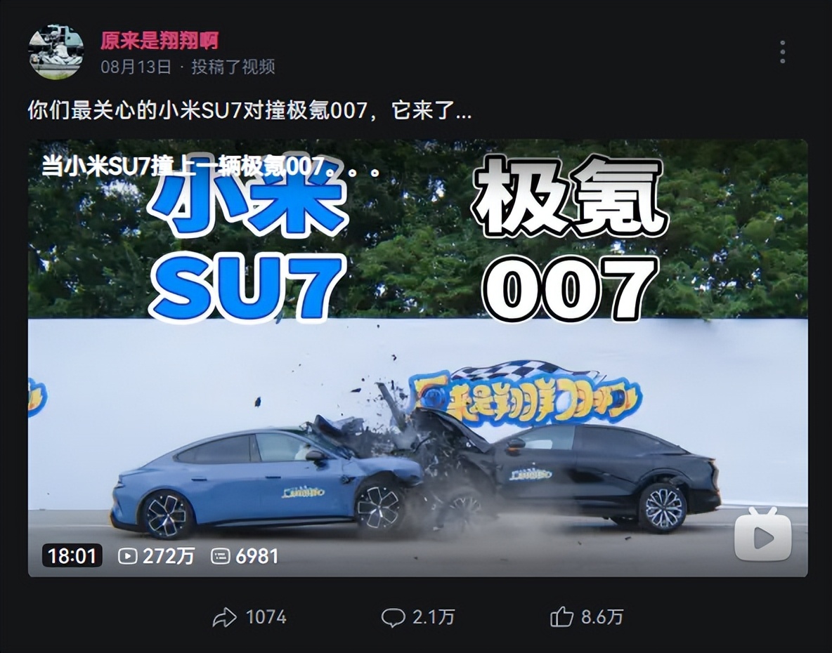 2024年8月13日,汽车博主高若翔(ID:原来是翔翔啊)在B站发布了一段名为《当小米SU7撞上一辆极氪007》的视频,引发广泛关注,话题#当小米SU7撞上一辆极氪007#登上热搜榜。