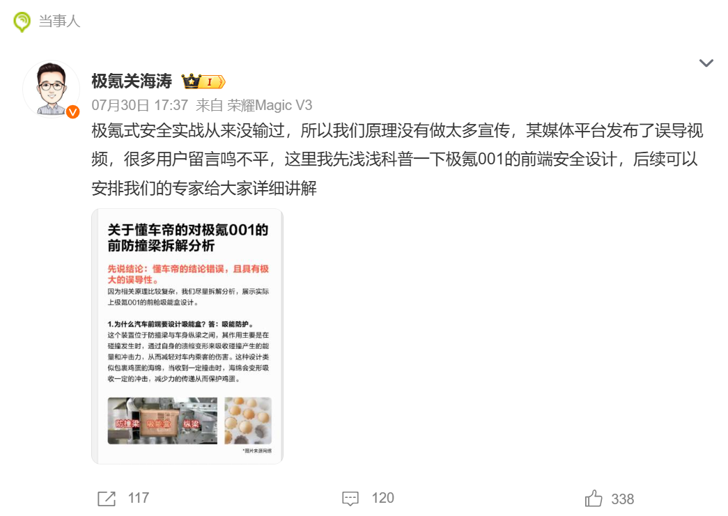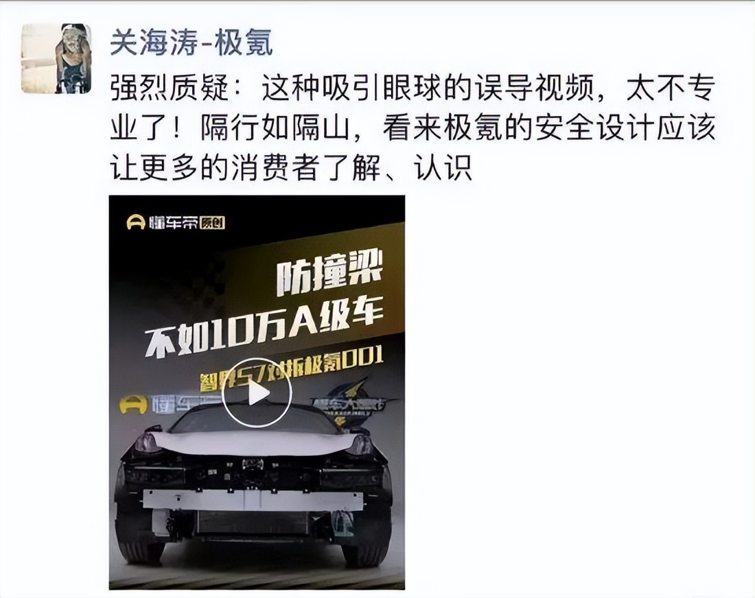 2024年7月30日,极氪CMO关海涛在朋友圈发文炮轰懂车帝,称其评测视频“太不专业”。其转发的视频显示,懂车帝在评测视频中称,智界S7对拆极氪001,发现极氪001的防撞梁不如10万A级车。关海涛随后又在微博科普了极氪001的前端安全设计,称后续可以安排专家给大家详细讲解。