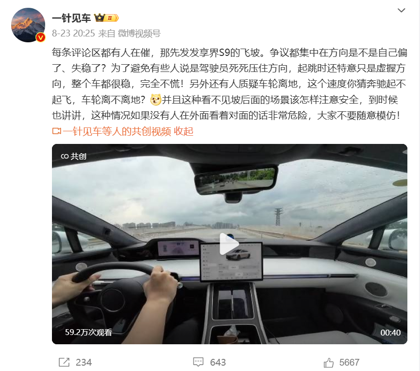 8月23日20:25,一针见车和电车小飞在微博和抖音发布了享界S9先后3次飞坡的车内车外视频,视频中享界S9未出现颠簸转向现象。